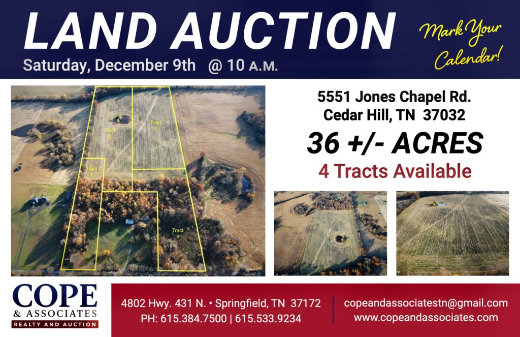 ON-SITE AUCTION December 9th @ 10AM. Come join us for the auction of this serene, very private 36+/- acres of unrestricted land. Property is located on a dead end road, surrounded by row crops. Would make a great site for a mini farm, or if you enjoy watching wild life, there are plenty of deer and turkey in this part of the county. There are woods on the front portion along with rolling hills on the back portion. Parcel will be sold in four tracts. Tract 1 – 5.07 +/- Acres. Tract 2 – 13.50 +/- acres. Tracts 3 – 13.52 +/- acres. Tract 4 – 5.04 +/- acres. 15% down due day of sale. Remaining balance due within 30 days. All announcements made on the day of auction take precedence over previous advertisements.